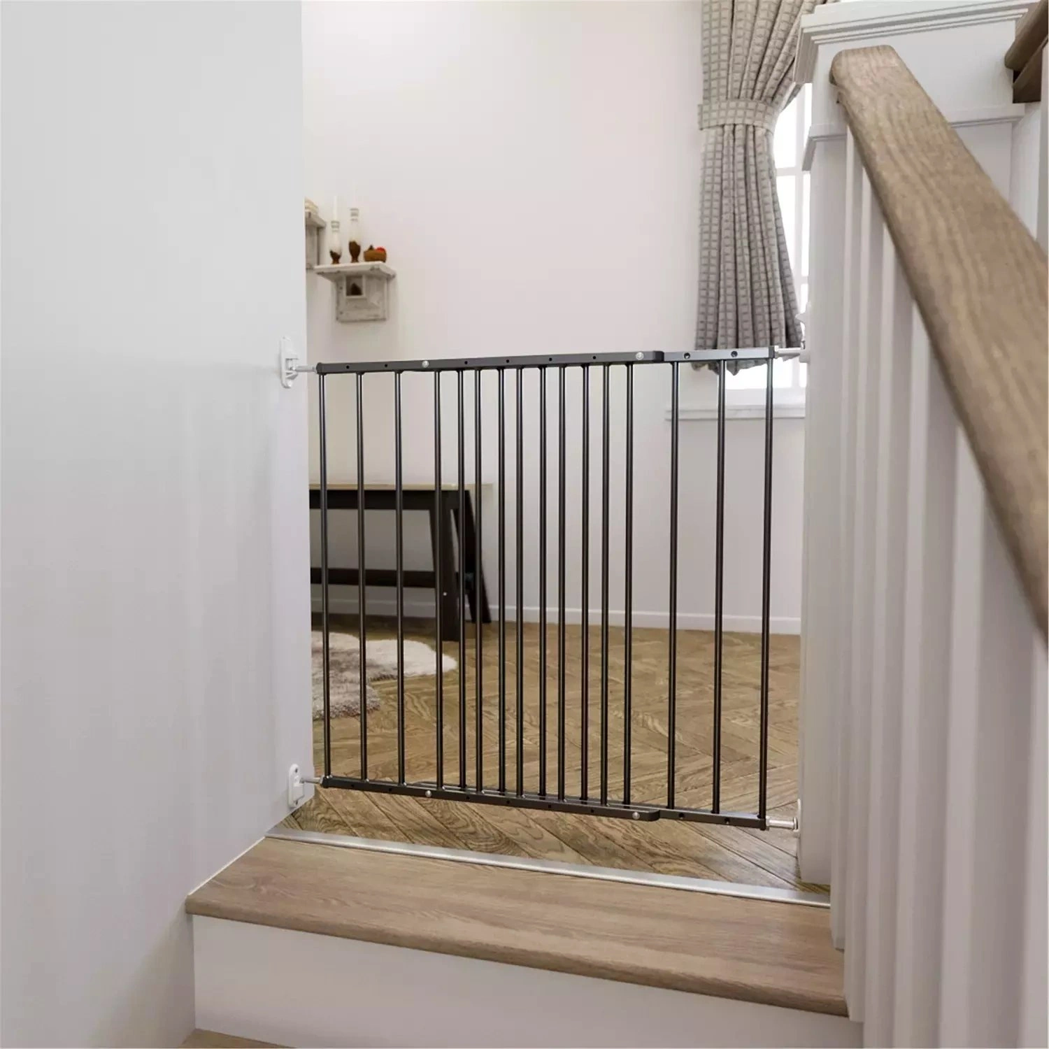 - The gate is designed to fit into doorways and places at the top or bottom of stairs.